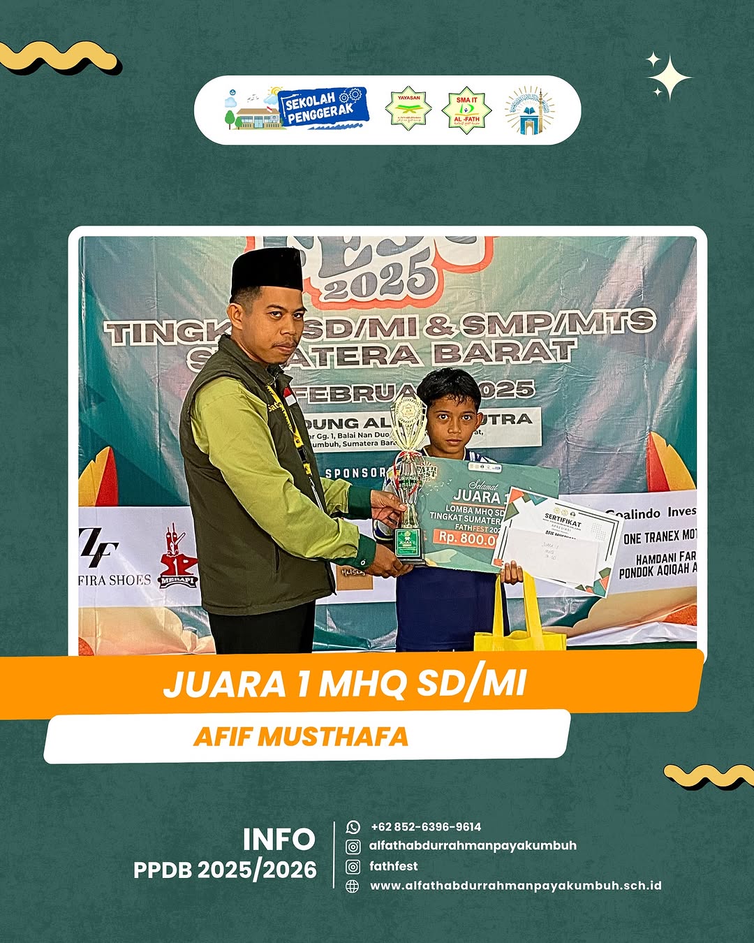 Alhamdulillah, 12 Siswa Kami Terpilih Mengikuti Daurah Wahyain 2025 di STIU Wadi Mubarak BogorAlhamdulillah, 12 Siswa Kami Terpilih Mengikuti Daurah Wahyain 2025 di STIU Wadi Mubarak Bogor adminadmin 0 Comments 10:06 am Alhamdulillah Bini’matihi Tati Musholohaat pada hari ini, 24 Juni 2025, sebanyak 12 santri Takhassus dari Yayasan al-Fath Abdurrahman Payakumbuh telah{...} READ MOREREAD MORE