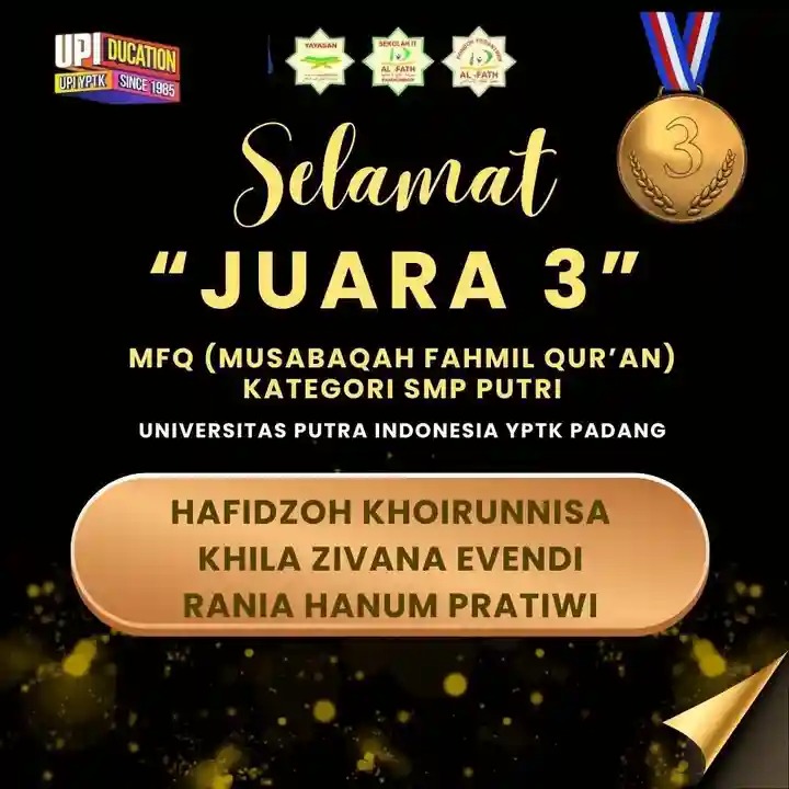 الحمد لله الذي بنعمته تتم الصالحات Siswi SMP dan SMA IT Al-Fath Payakumbuh ikut serta dalam MHQ (Musabaqah Hifdzil Qur’an) dan MFQ (Musabaqah Fahmil Qur’an) adalah kompetisi yang diselenggarakan oleh UPI YPTK Padang sebagai bagian dari kegiatan Qur’an Fest pada Tanggal 14 Mei 2025. Alhamdulillah biidznillah siswi Al-Fath Payakumbuh mendapatkan juara pada lomba tersebut. Semoga ini bisa menjadi motivasi bagi siswa untuk terus meningkatkan hafalan Al Qur’an dan meningkatkan pemahaman kandungan isi Al Qur’an.