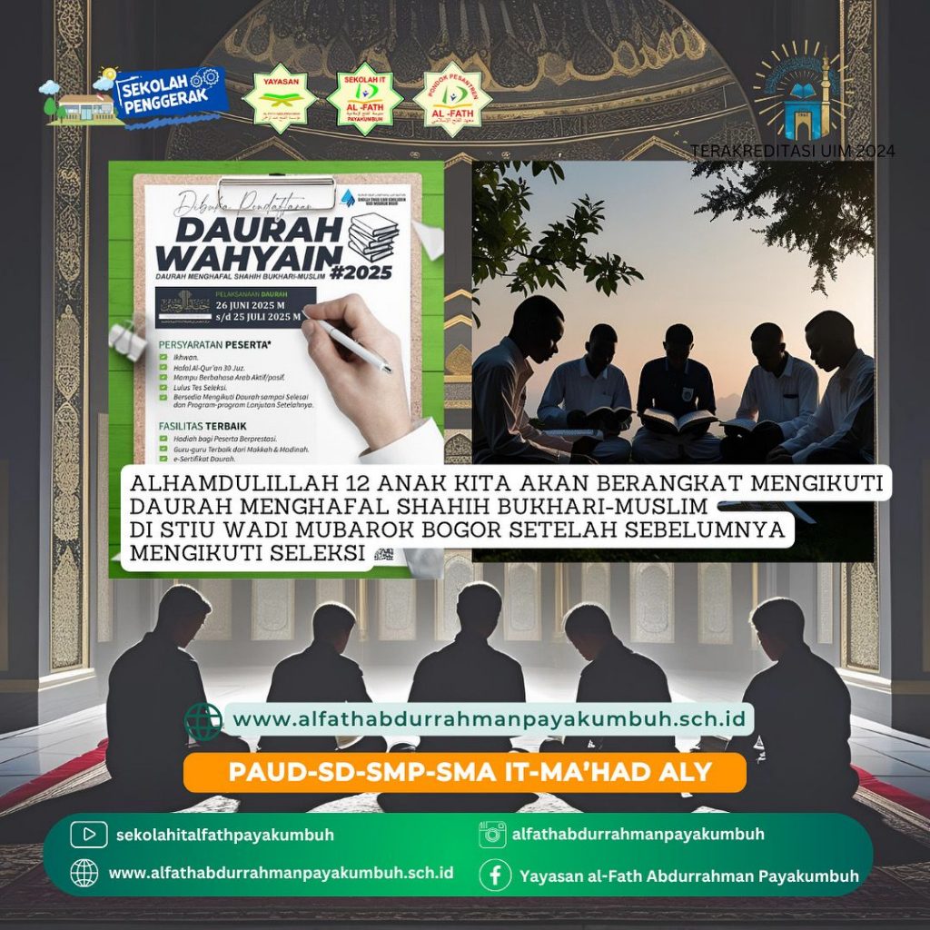 Alhamdulillah Bini’matihi Tati Musholohaat pada hari ini, 24 Juni 2025, sebanyak 12 santri Takhassus dari Yayasan al-Fath Abdurrahman Payakumbuh telah lolos seleksi dan akan berangkat mengikuti kegiatan Daurah Wahyain 2025 — sebuah program intensif menghafal Shahih Bukhari-Muslim yang diselenggarakan di STIU Wadi Mubarak, Bogor.