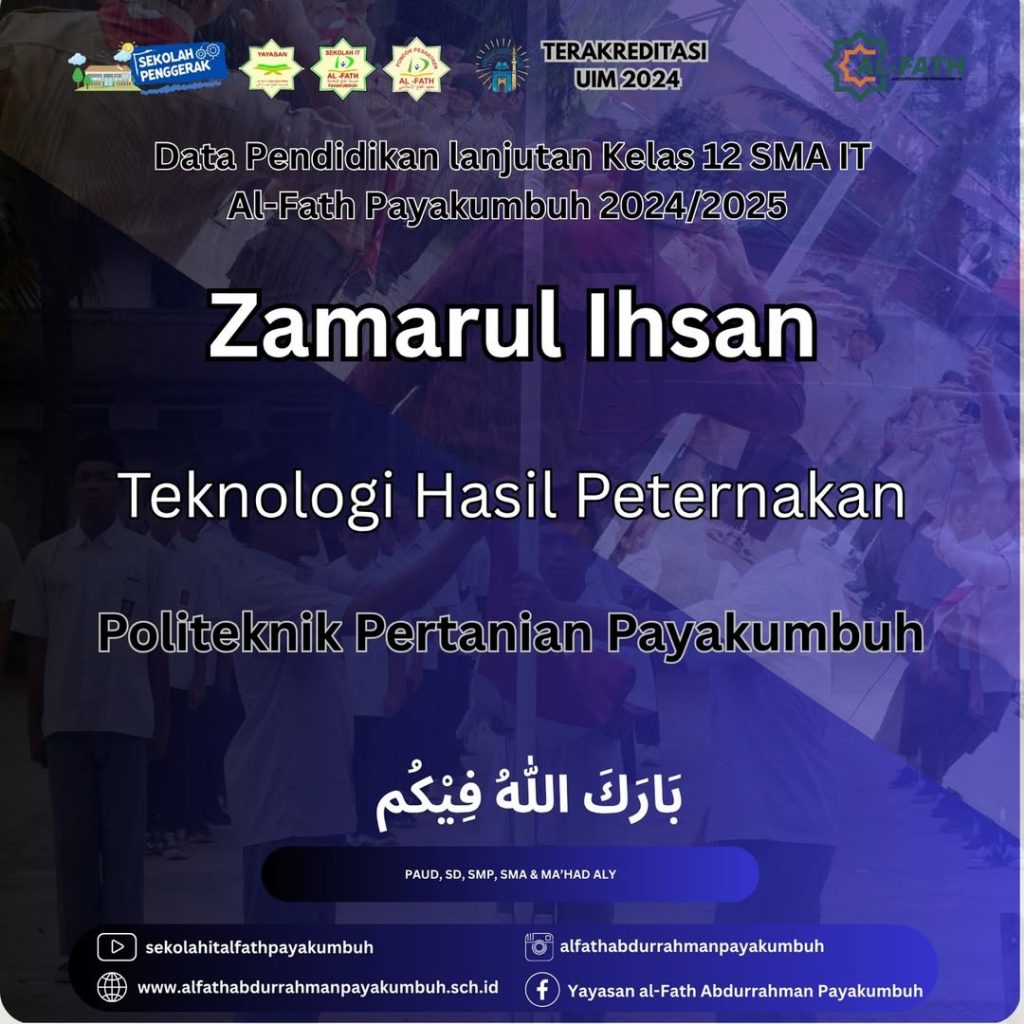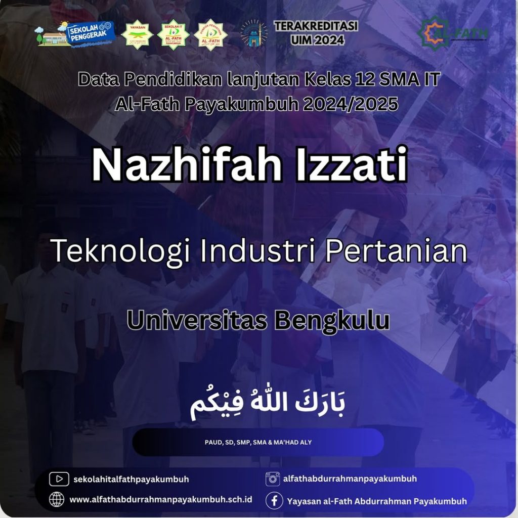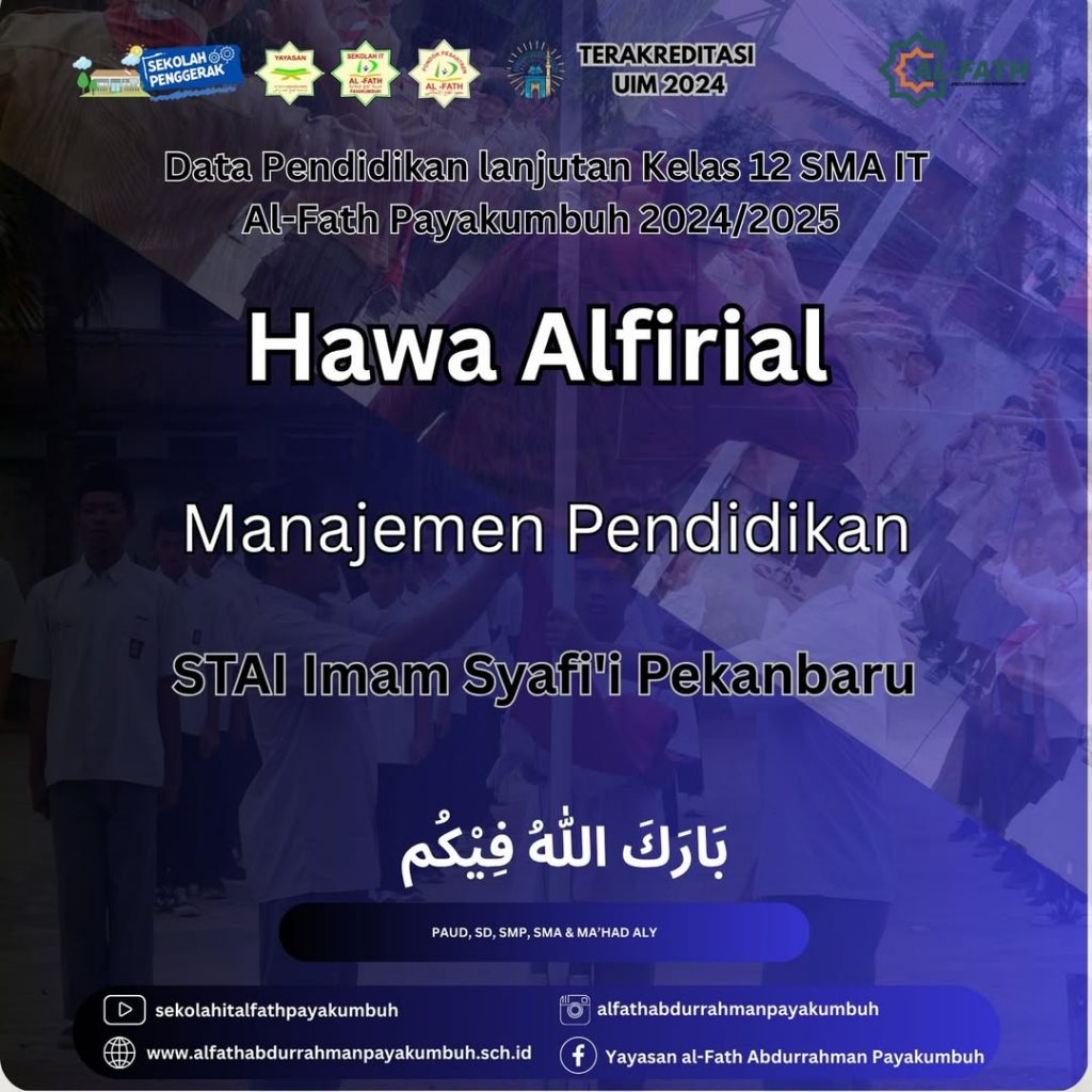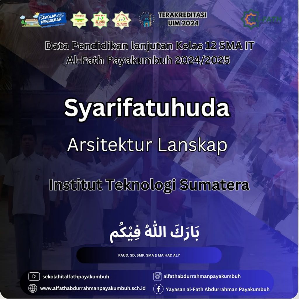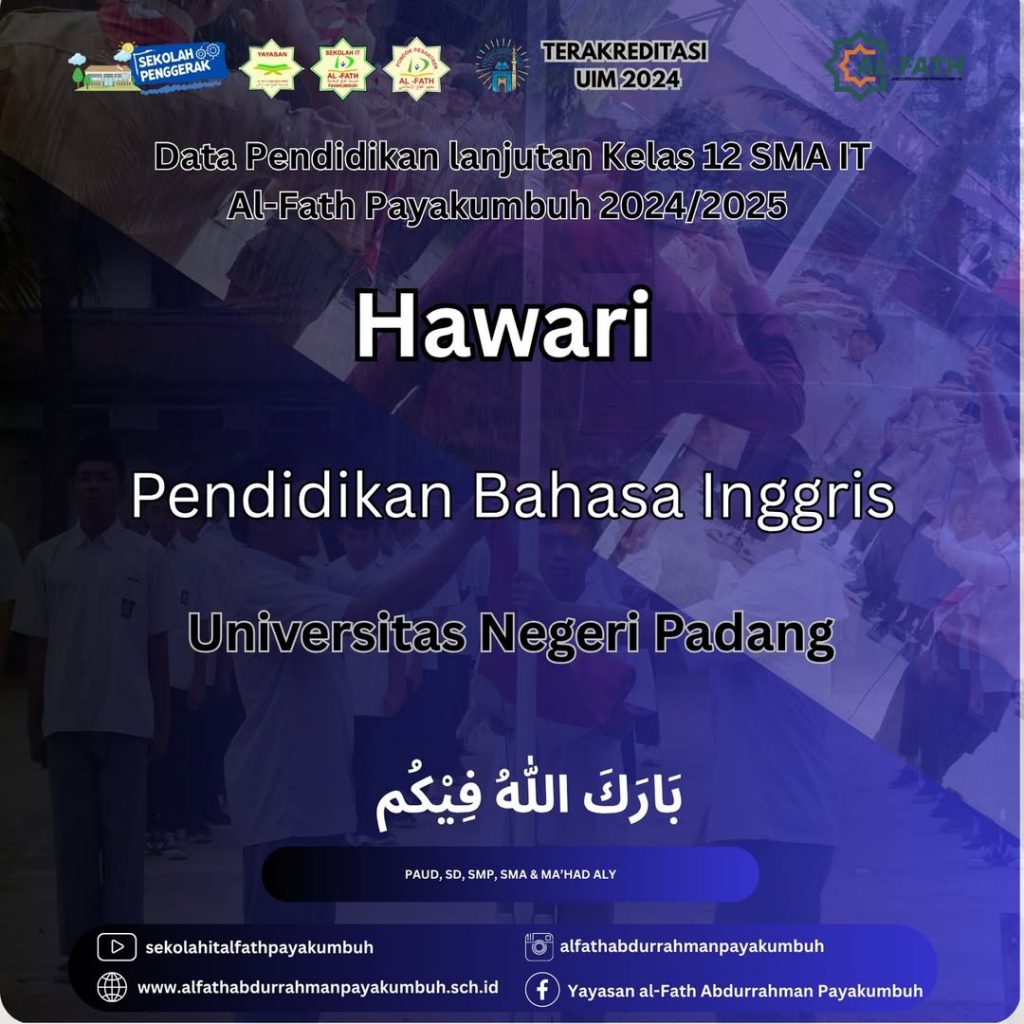 Alhamdulillah, kabar gembira datang dari para alumni kelas XII SMA IT Al-Fath Payakumbuh tahun ajaran 2024/2025 yang telah berhasil melanjutkan pendidikan ke perguruan tinggi impian mereka.