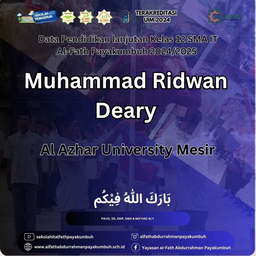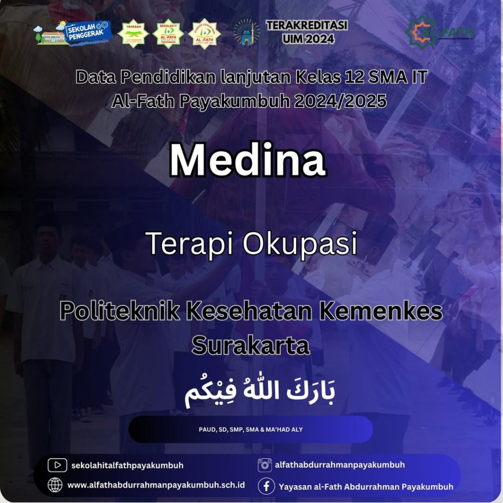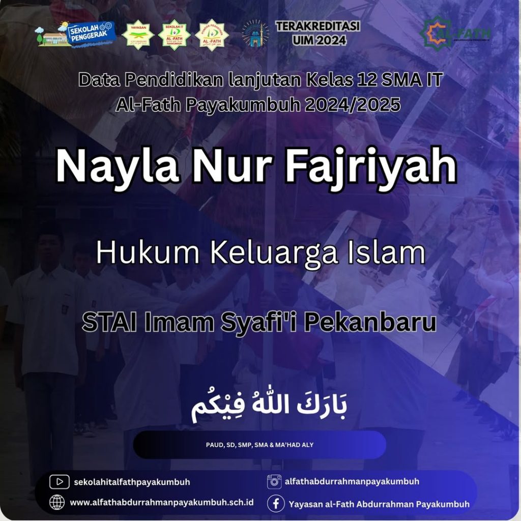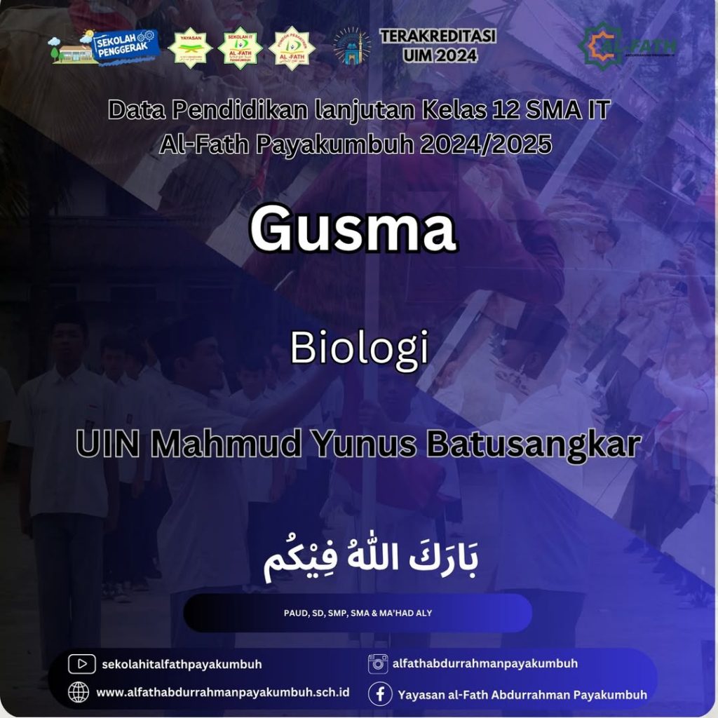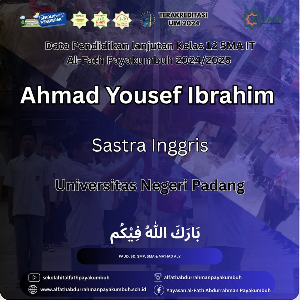 Alhamdulillah, kabar gembira datang dari para alumni kelas XII SMA IT Al-Fath Payakumbuh tahun ajaran 2024/2025 yang telah berhasil melanjutkan pendidikan ke perguruan tinggi impian mereka.
