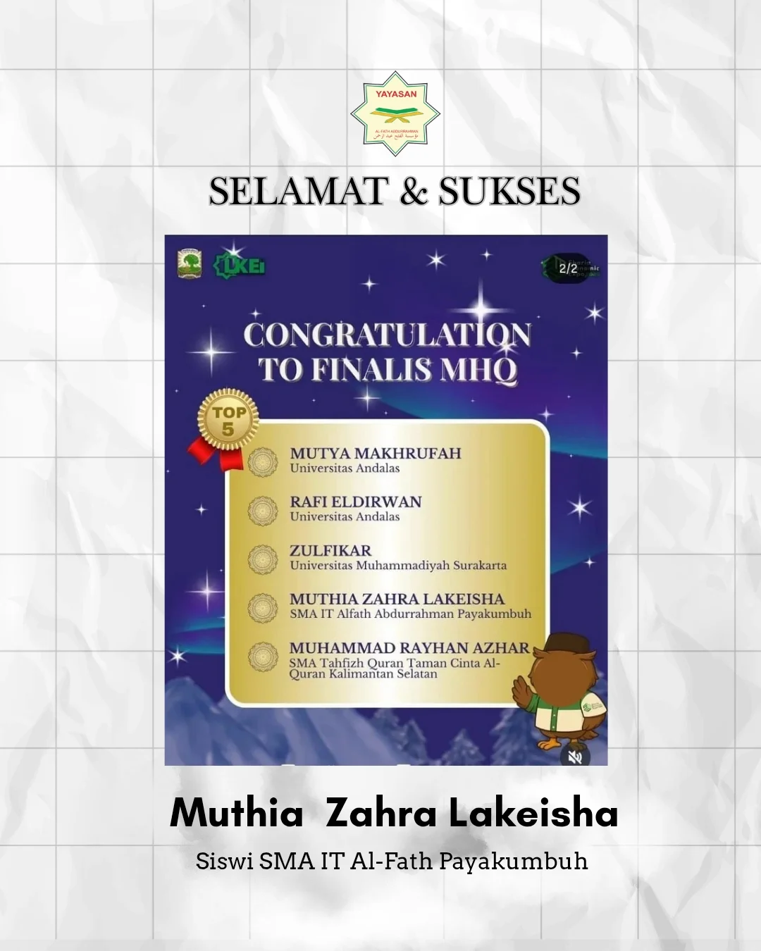 Alhamdulillah, selamat dan sukses kami ucapkan kepada Muthia Zahra Lakeisha, siswi SMA IT Al-Fath Abdurrahman Payakumbuh, yang berhasil lolos sebagai TOP 5 Finalis Musabaqah Hifdzul Qur’an (MHQ) pada ajang Syariah Economic Expo 2025 di Universitas Andalas.